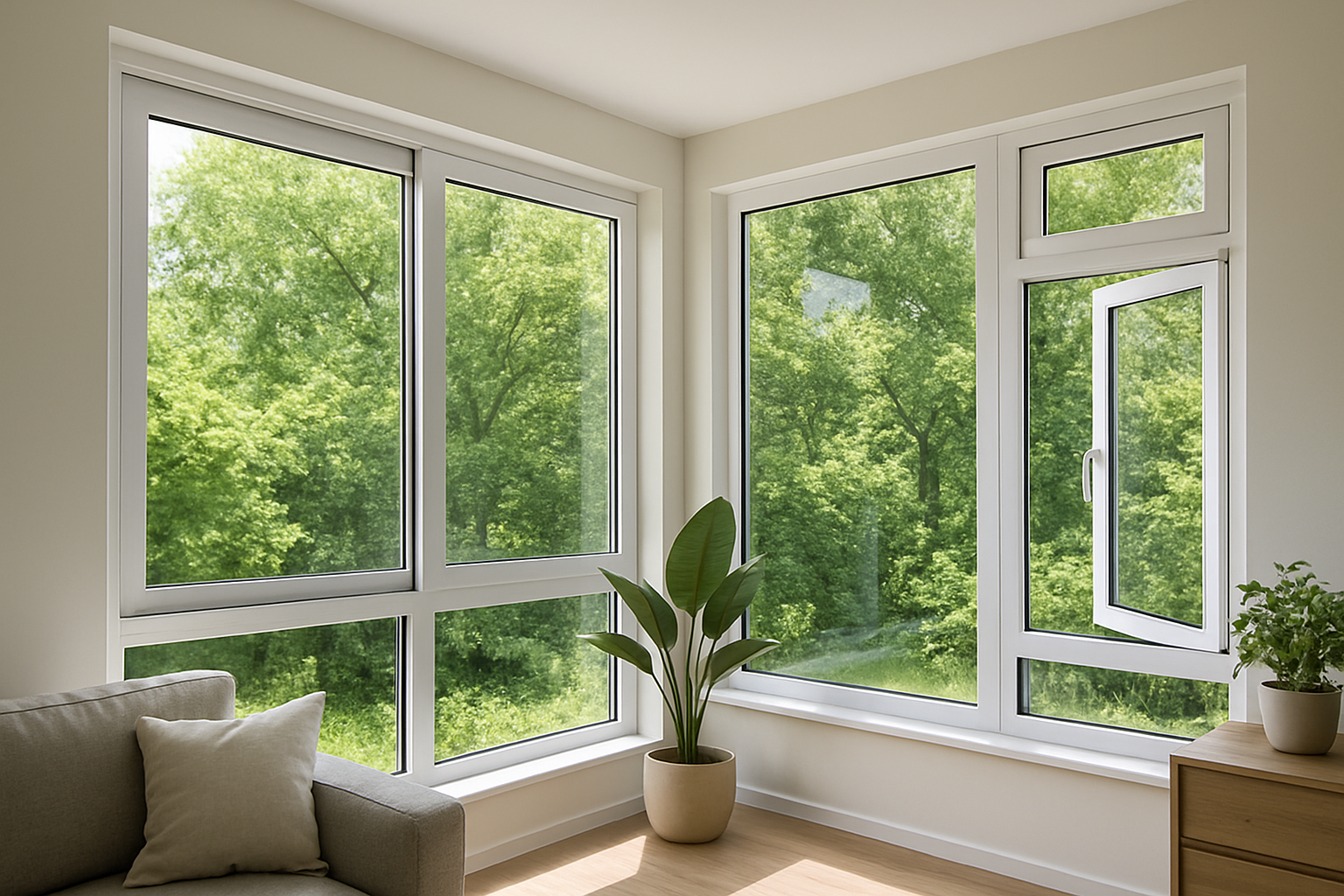 uPVC fixed windows are a sleek and elegant choice for spaces where ventilation is not a priority but maximum natural light and unobstructed outside views are desired. Designed to remain closed, these windows act as a permanent fixture, offering superior insulation, soundproofing, and energy efficiency. Their minimalist design makes them perfect for living rooms, offices, staircases, or any area where adding brightness and openness is important.